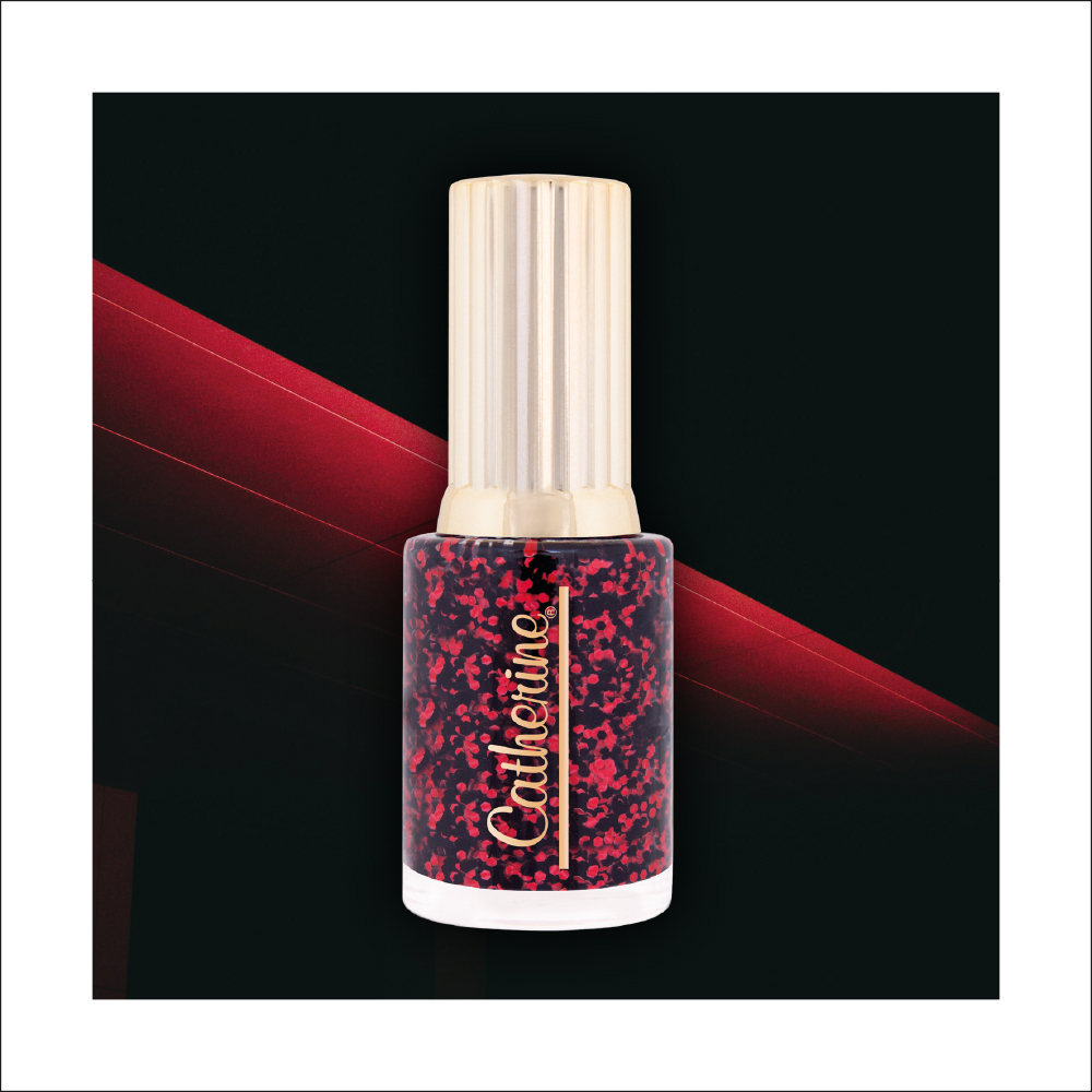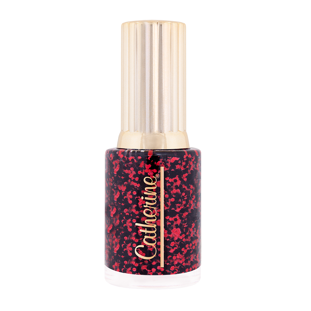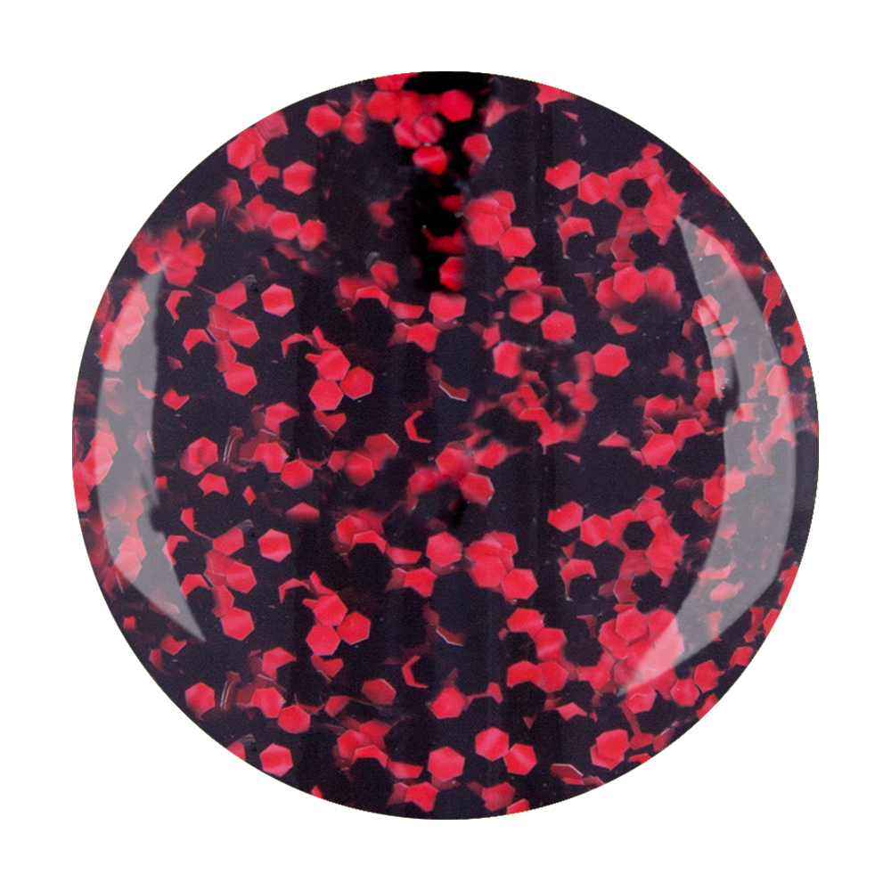 Schwarz-roter Überlack für die Nägel. Dieses Produkt ist ein Duo Lac, er kann sowohl als Farblack zum vollflächigen Auftrag als auch als Effekt-Top Coat genutzt werden.