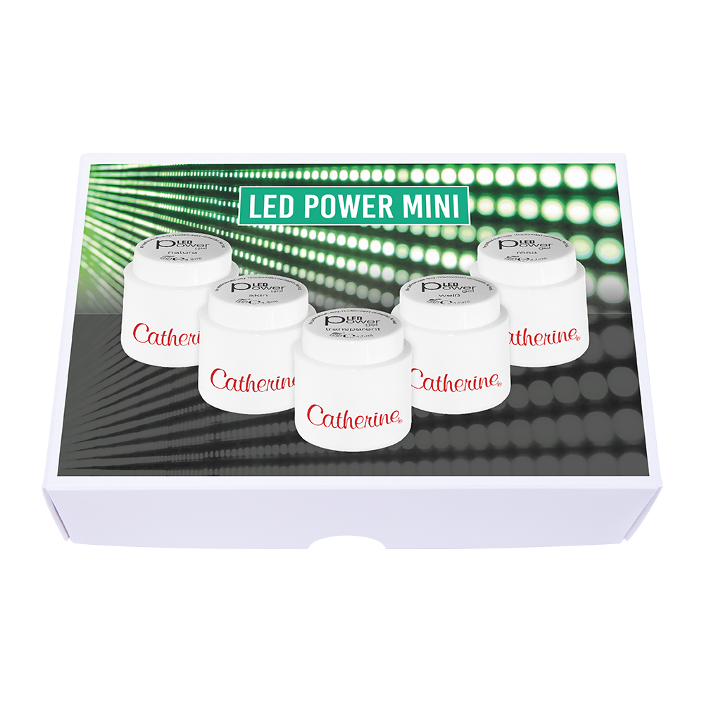Seien Sie bereit und lernen Sie unsere LED Power Gele kennen. Mit unserem praktischem Mini-Set haben Sie die Möglichkeit, alle Farben zu testen. Sie werden begeistert sein! Überzeugen Sie sich selbst und gehen Sie mit uns in Richtung Zukunft. LED - Wir stellen unser Gel auf den Prüfstand. Diese Gele werden bei richtiger Anwendung nicht heiß, können ganz dünn gearbeitet werden und sind zudem extra stark. Nutzen Sie die Kraft, die aus der Tiefe kommt, denn LED ist noch schneller, noch dünner und noch stärker, als alles, was bisher da war. Enthält: je 1 x LED power gel natura, skin, transparent, weiß, rosa à 5 g / 4,5 ml / 0,16 fl.oz.
