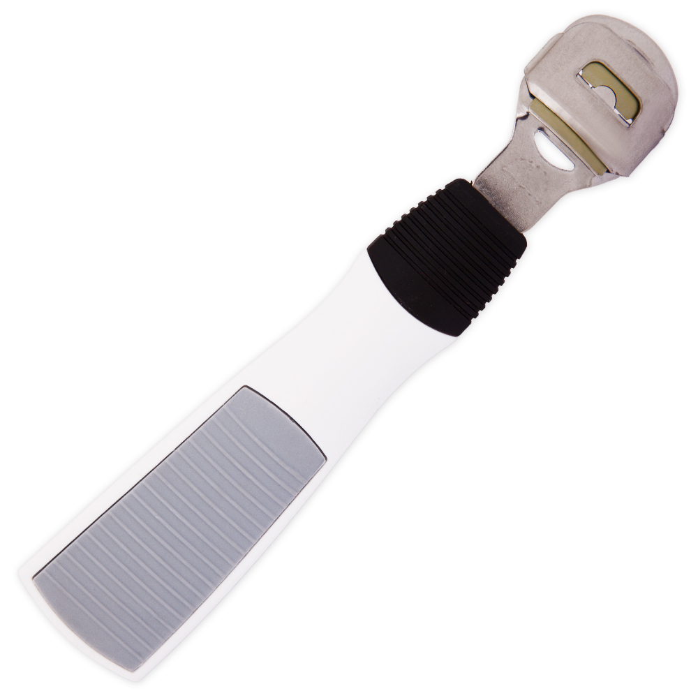 Werkzeuge für geschmeidige und gepflegte Füße. Hornhauthobel mit flexiblem Griff für das effektive Entfernen starker Verhornungen. Anschließend sollten die Übergänge mit einer Hornhautraspel bearbeitet werden, bevor im letzten Arbeitsschritt mit der Mineralfußfeile die Haut nachhaltig geglättet wird.