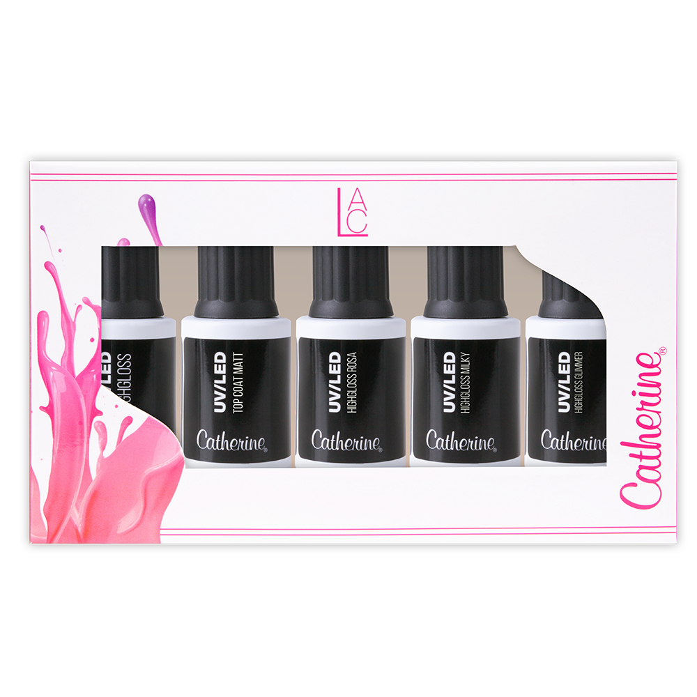 Fünf Versiegelungsgele in einer Box. Sorten: UV/LED Highgloss, UV/LED Highgloss Rosa, UV/LED Highgloss Milky, UV/LED Top Coat Matt, UV/LED Highgloss Glimmer gold, UV/LED, UV/LED Highgloss Glimmer blue à 8 ml. Davon 1 Stck. GRATIS (Sorte und Menge bitte bei Bemerkungen angeben)