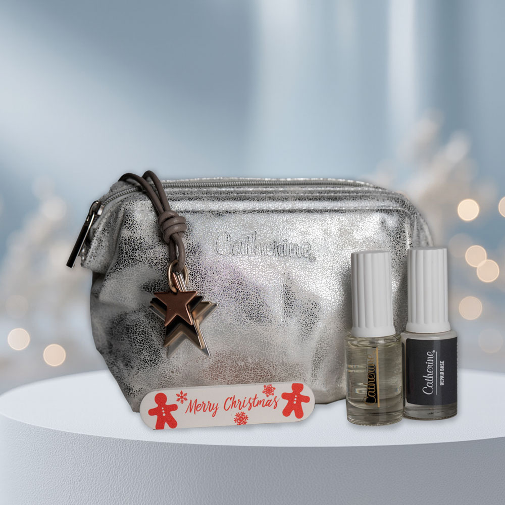 Das elegante Set enthält alles für gepflegte Nägel in einer silbernen Tasche – perfekt als Geschenk oder zum Selbstverwöhnen.