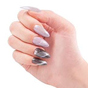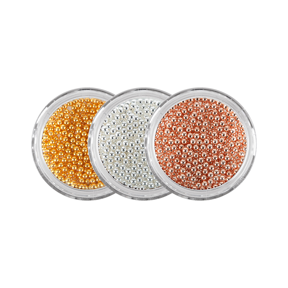 Rose gold-colored mini pearls. Using the Pick & Place tool, the pearls can be easily positioned on the nail. The pearls automatically attract each other, ensuring an easy linear arrangement.